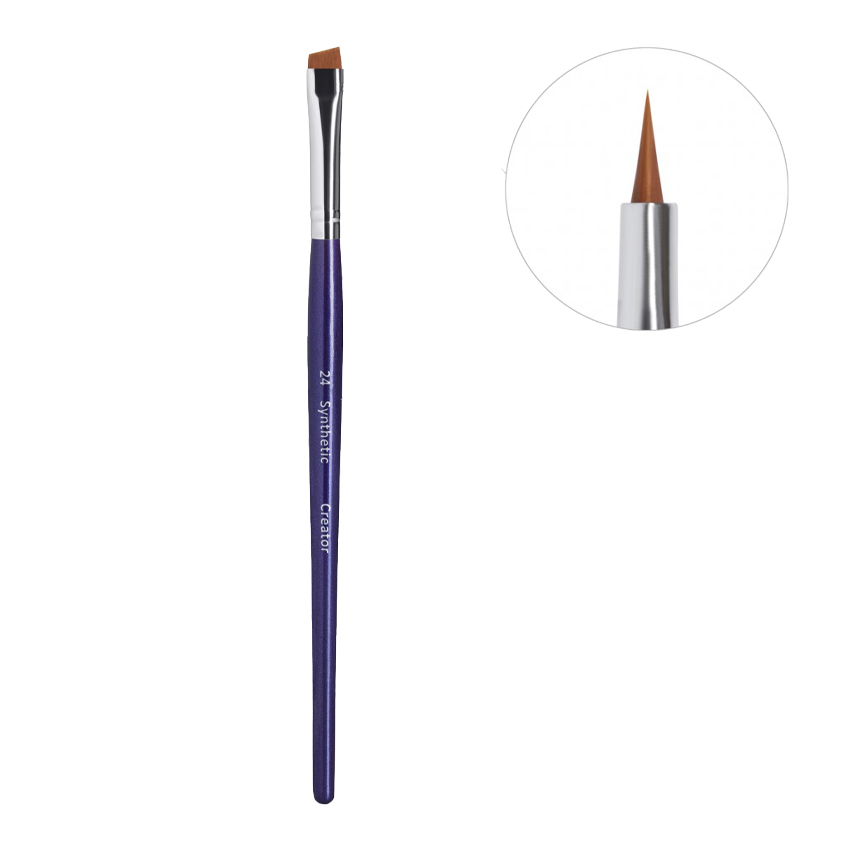 Creator Synthetic №24 — это профессиональная широкая скошенная кисть из синтетического ворса, специально разработанная для работы с бровями. Она отличается высокой упругостью, что позволяет мастеру легко и равномерно распределять краситель или хну по коже и волоскам.