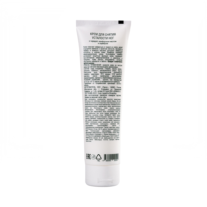 Крем помогает избавиться от тяжести в ногах, дарит ощущение свежести и приятной легкости. Экстракты череды и конского каштана улучшают обменные процессы в клетках кожи. Камфора усиливает микроциркуляцию крови и оказывает болеутоляющее действие. Серебро активирует защитные функции кожи, блокирует проникновение болезнетворных микроорганизмов в царапины и трещины. Крем быстро впитывается, оставляя ощущение комфорта и заботы. Продукт клинически протестирован.