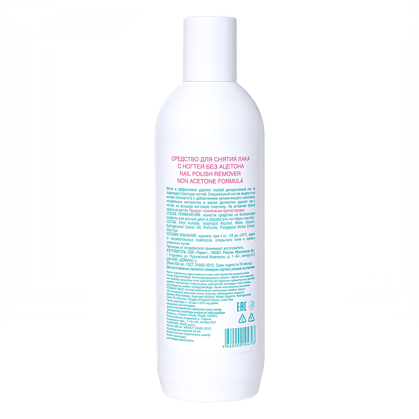 - Основной растворитель: В основе жидкости используется этилацетат (Ethyl Acetate) вместо ацетона, что делает ее более щадящей для ногтей.