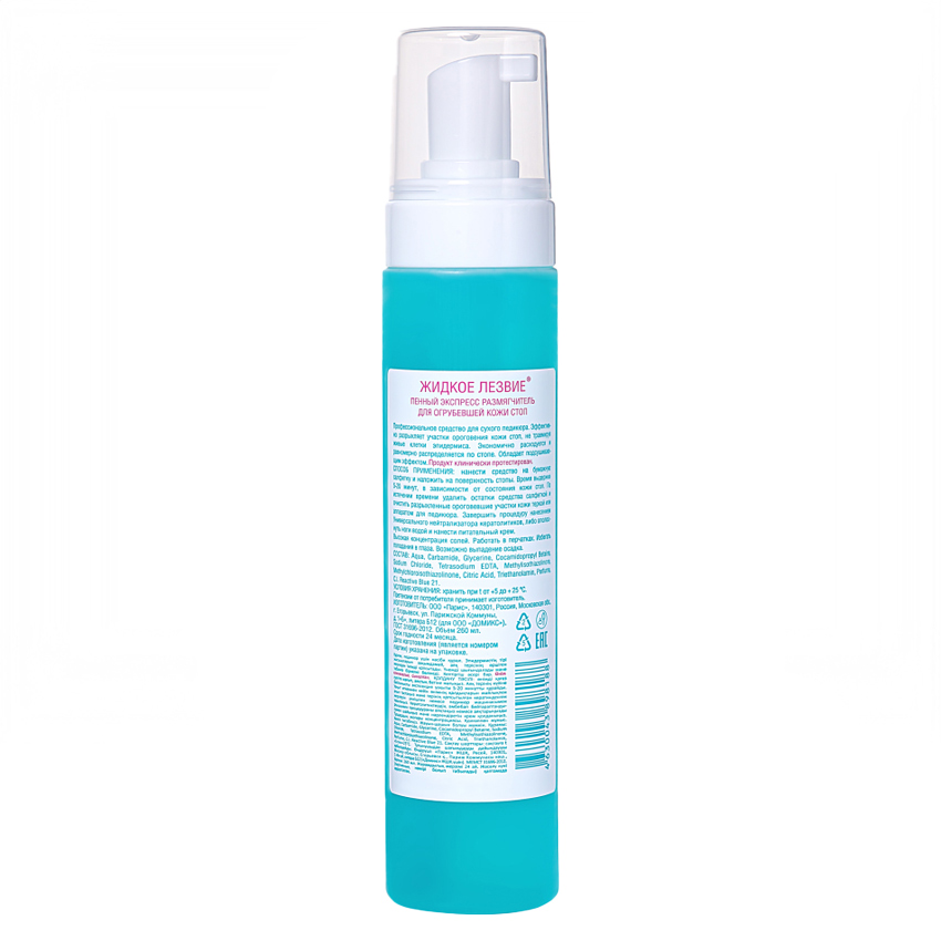 Способ применения: нанести средство на бумажную салфетку и наложить на стопу. Через 7-15 минут убрать салфетку с остатками пены, очистить разрыхлённые ороговевшие участки кожи педикюрной тёркой (с наждачной бумагой) или сделать аппаратный педикюр. Ополоснуть водой или обработать Универсальным нейтрализатором кератолитиков.Для завершения процедуры нанести крем.