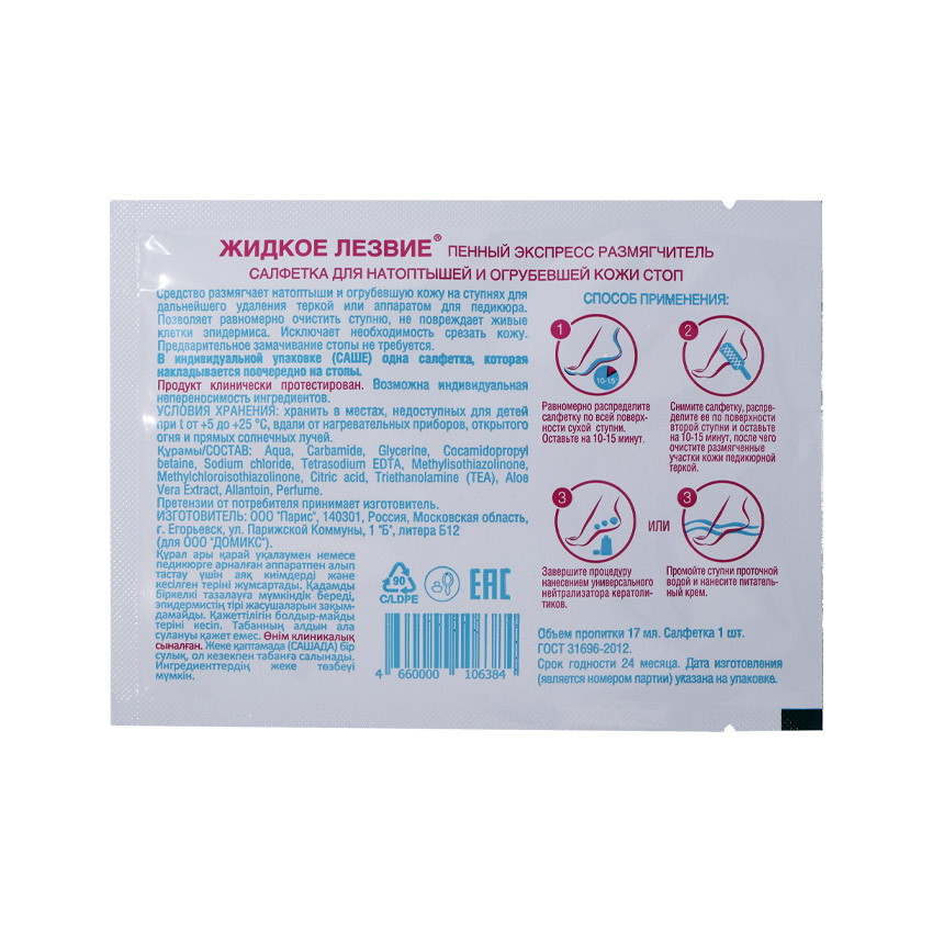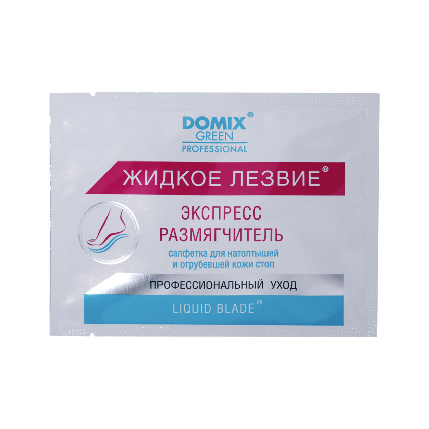 Салонное средство “Жидкое лезвие” экспресс размягчитель в саше исключает необходимость замачивания ступней ног, значительно сокращает и делает более комфортной процедуру необрезного педикюра. Пропитанная средством салфетка полностью распределятся по всей поверхности ступни клиента. Входящие в состав средства кератолитики быстро размягчают натоптыши и огрубевшую кожу (в т.ч. при гиперкератозе), позволяя очистить ступню педикюрной теркой без необходимости срезать и травмировать кожу. Состав “Жидкого лезвия” воздействует только на ороговевшие участки и не травмирует живые клетки эпидермиса. При регулярном применении средства стопы остаются нежными, надолго предотвращается образование трещин и натоптышей. Также средство можно использовать перед процедурой аппаратного педикюра.