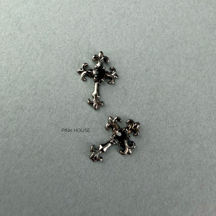 Pink House представляет стильный металлический аксессуар для создания дерзкого и выразительного маникюра. Объемная фигурка в форме готического креста, инкрустированная глубоким черным кристаллом, станет центральным акцентом вашего дизайна.