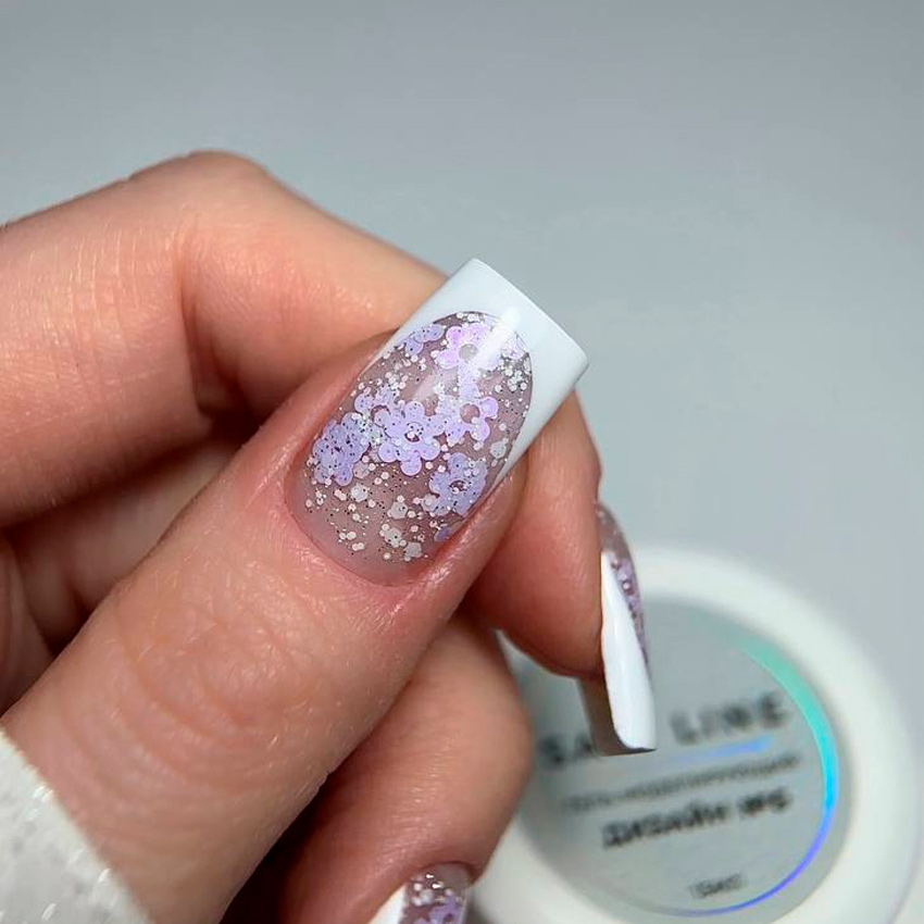 Гель моделирующий Safi Line, Гель моделирующий Дизайн №06, 15 мл представляет собой прочный материал для создания и укрепления ногтей с декоративным эффектом в виде цветков, шестигранников. №6 это прозрачная кристальная основа наполненная перламутровыми цветами и шестигранниками.