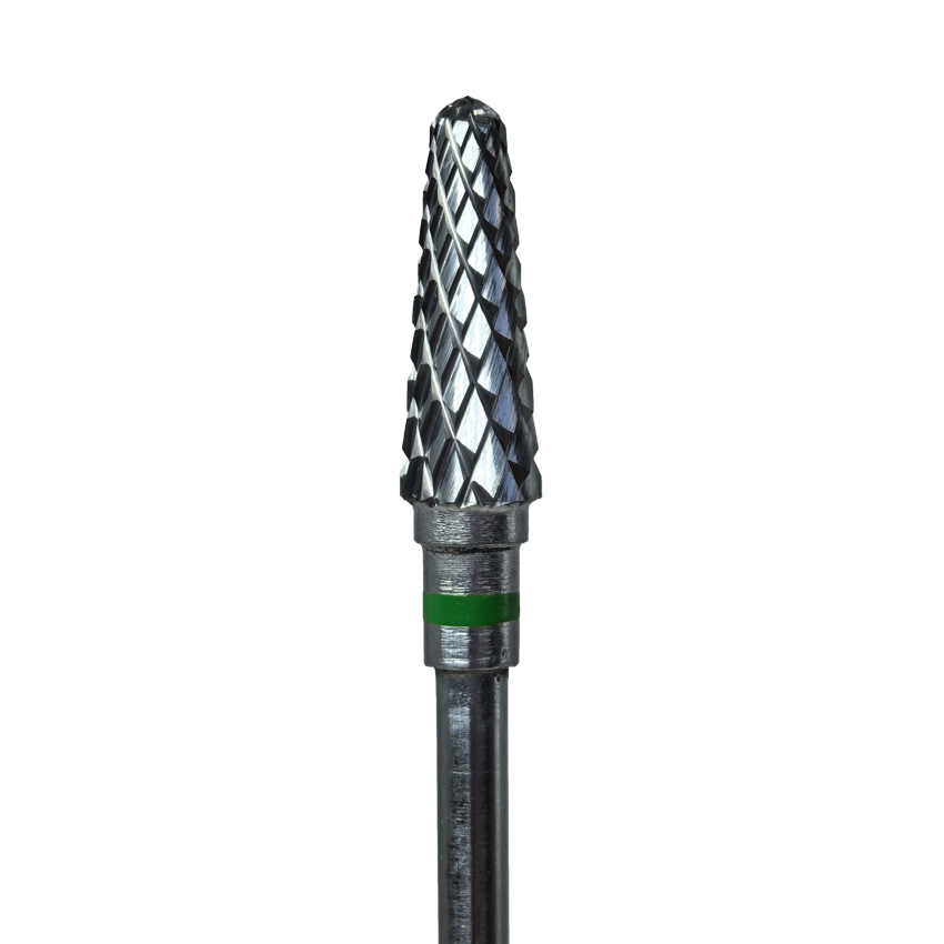 Твердосплавная фреза ТЗ.7 (форма «Ёлка») с крупной крестообразной нарезкой и зеленой насечкой — это профессиональный инструмент, предназначенный для скоростного снятия плотных искусственных материалов (геля, акрила, акригеля) и обработки гиперкератоза в подологии.